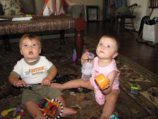 Annie is also starting to figure out how to pull herself up to stand. I've turned our living room into a save little play cove. We have a sectional couch and I pulled the ottoman out so it makes a U shape around the area rug. It has been a lot of fun for us; we fill it up with toys and play all day. She also has a safe area to practice pulling up. The couches are nice and soft so it’s not too bad when she doesn't make it up. I've seen her make it all the way to her feet about three times now and she gets so excited that she forgets that she can't balance and will just let go of the couch, lol. I'm sure she will have it down in the blink of an eye.